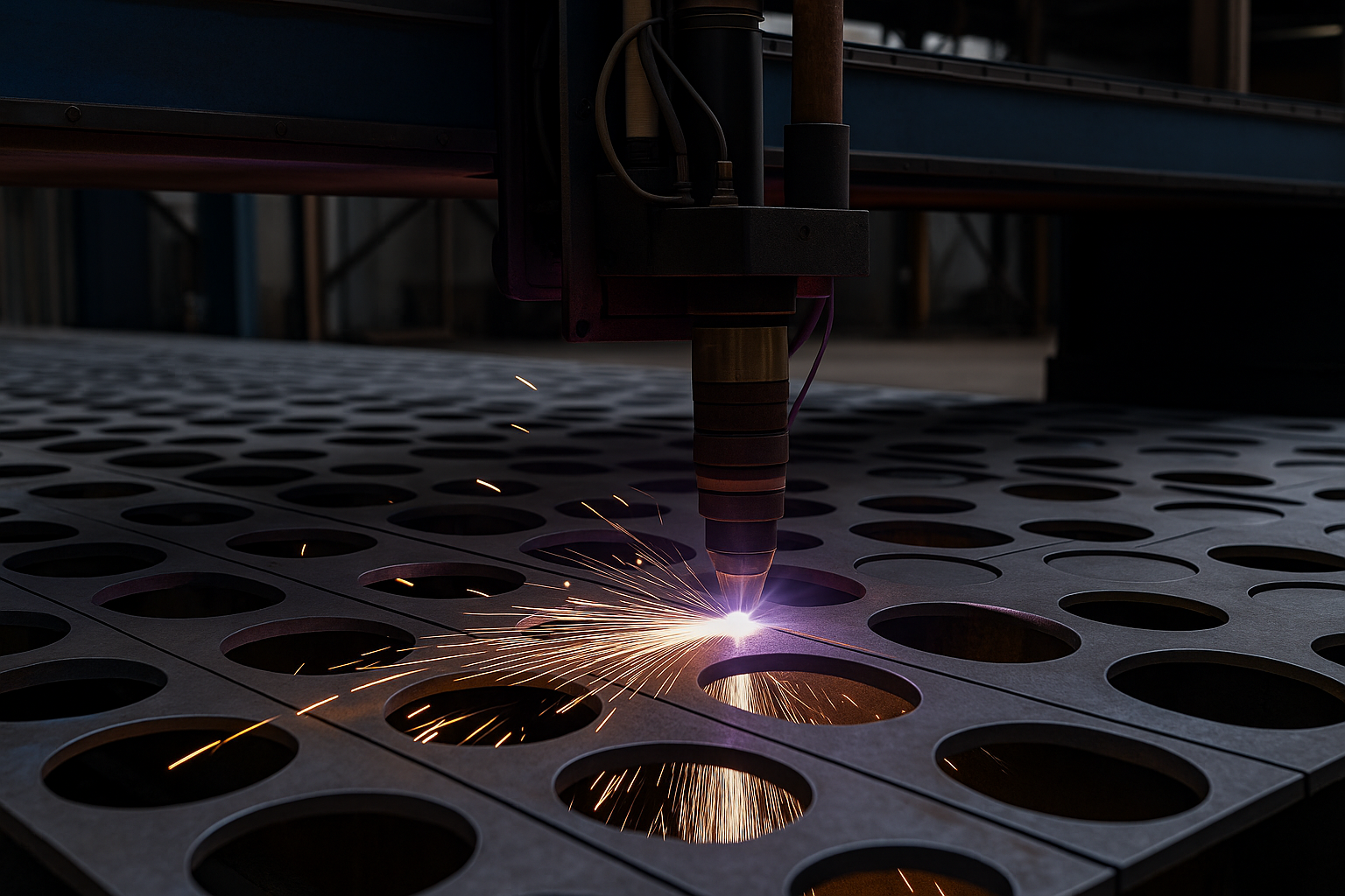 Telephelyünkön teljes körű megmunkálást végzünk: hegesztés, plazmavágás, élhajlítás, forgácsolás és szerkezeti szerelés.