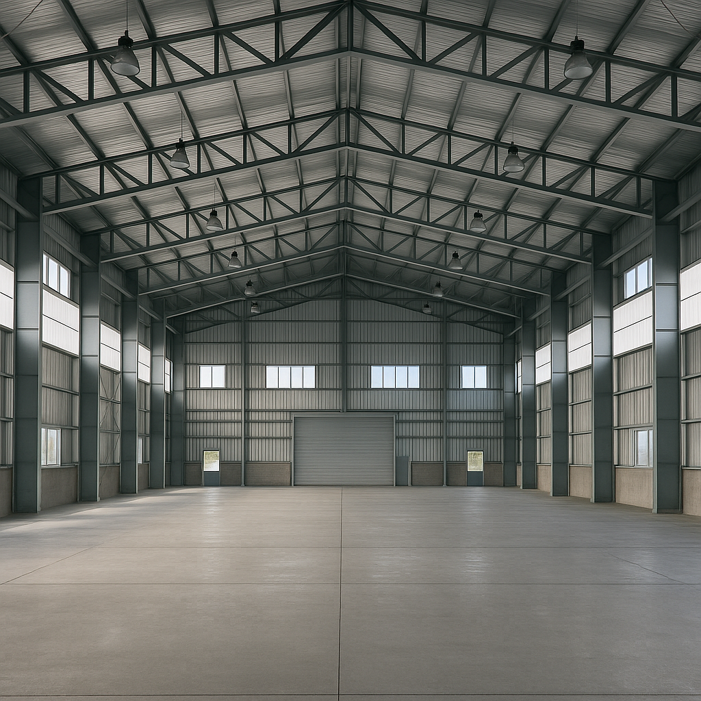 Komplett acélszerkezet gyártása és helyszíni szerelése egy mezőgazdasági géptárolóhoz.